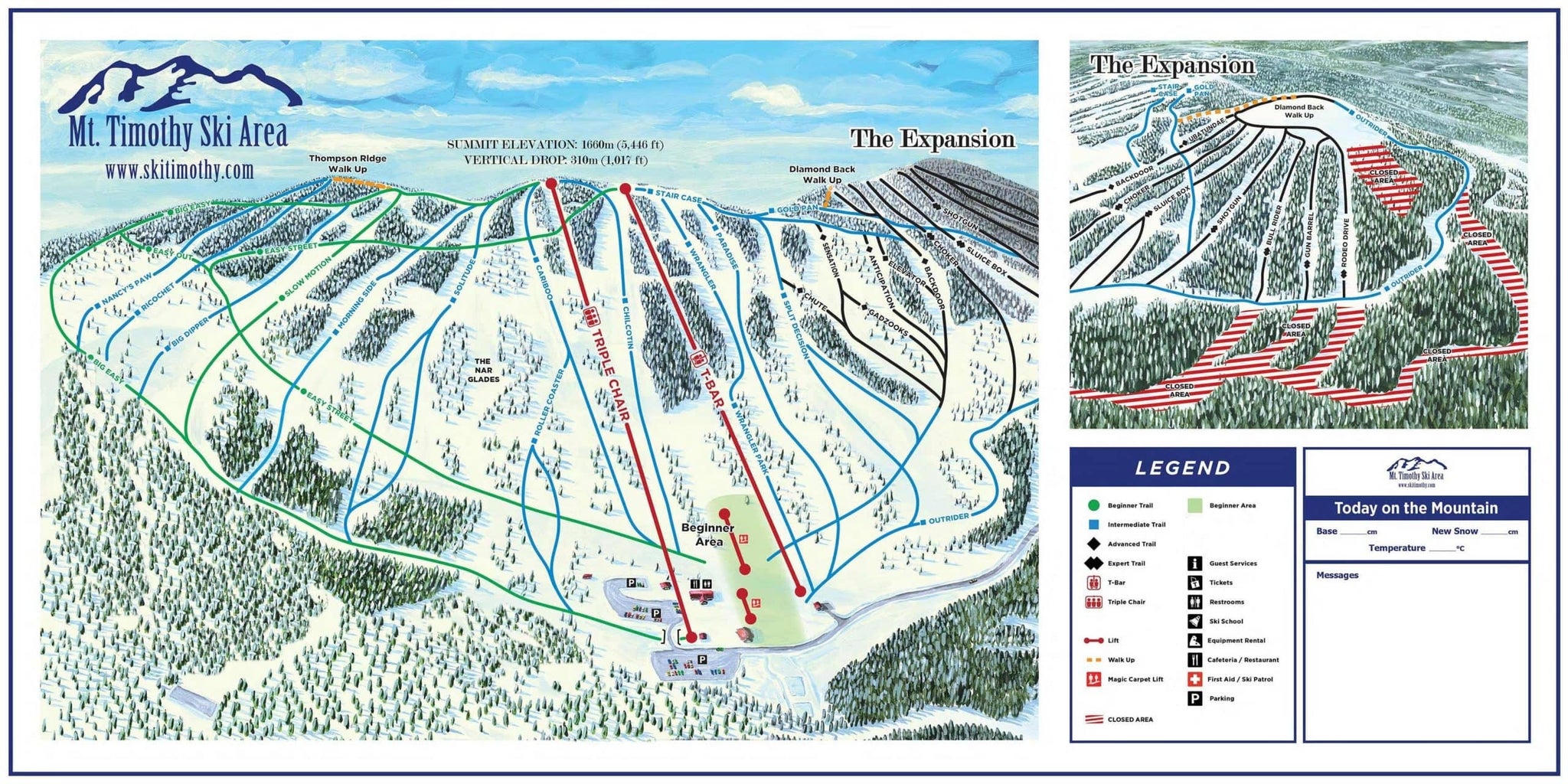Poznejte skiareál Mount Timothy - podívejte se, jak vypadá mapa střediska Mount Timothy, naplánujte si lyžování na další den nebo si znovu připomeňte tratě, které jste už na lyžích projeli. Kliknutím na mapu níže se obrázek zobrazí v nejvyšší kvalitě.