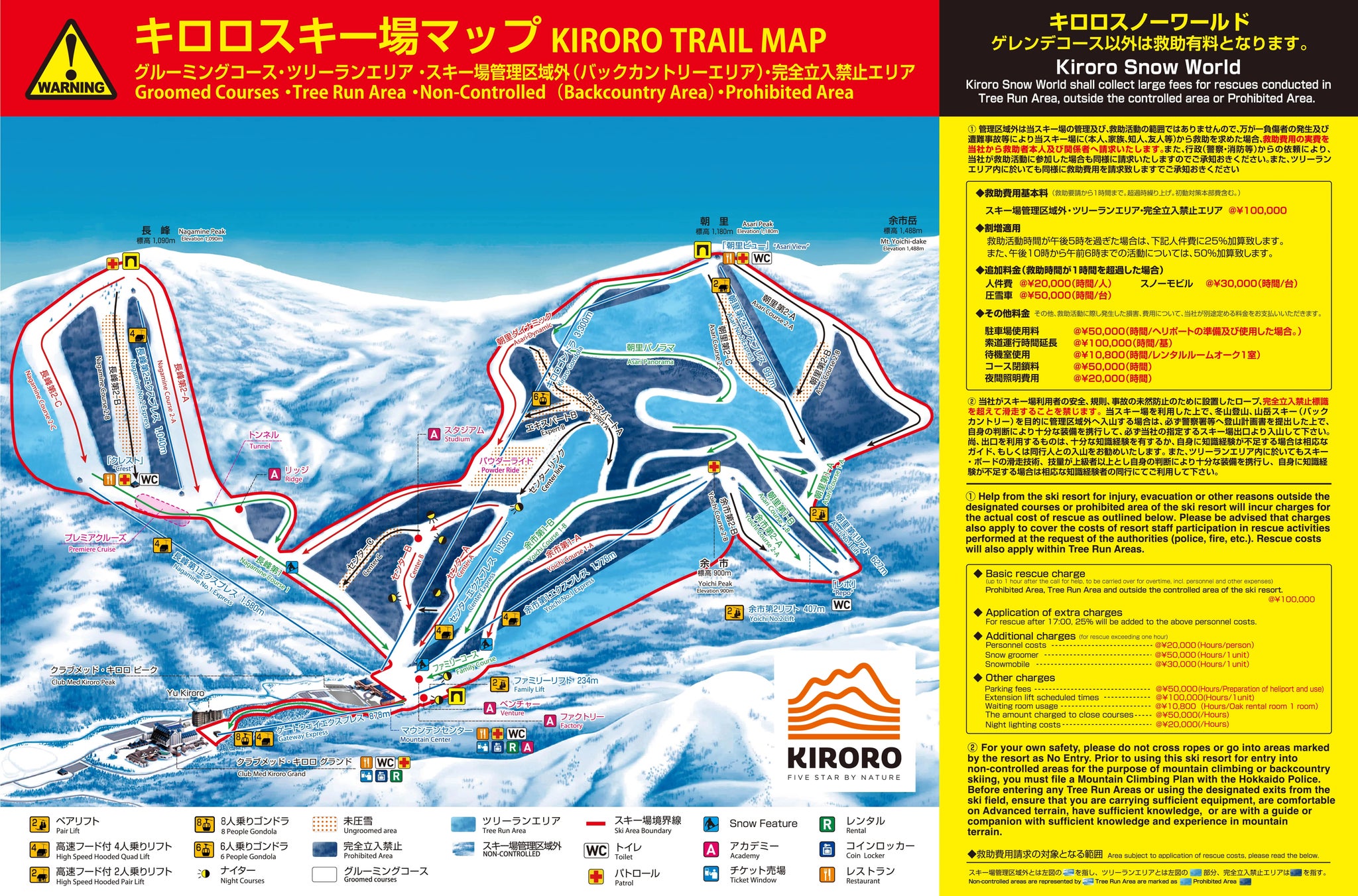 Lyžařský terén Kiroro se rozprostírá na přibližně 30 km tratí na dvou hlavních vrcholech: Asari a Nagamine. Rozložení je jasně rozděleno podle úrovně dovedností — široké zóny pro začátečníky, progresivní tratě pro mírně pokročilé a strmé sjezdy ve stylu backcountry pro zkušené lyžaře. Nadmořská výška se pohybuje od 570 m u spodní stanice do 1 180 m na vrcholu, s převýšením 610 m, které zajišťuje plynulý průběh většiny sjezdů.