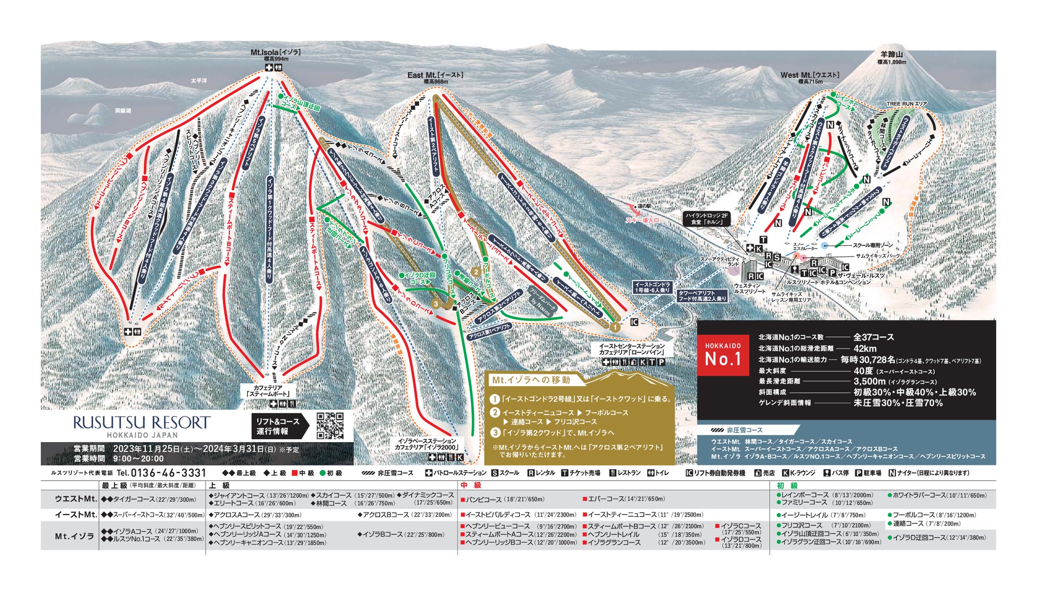 Lyžařský terén Rusutsu Resort se rozkládá na třech propojených oblastech — West Mountain, East Mountain a Mount Isola — přístupných pomocí lanovek a gondol, s jednotným skipasem. Celkem je zde přibližně 42 km sjezdovek, s nadmořskou výškou od 400 do 994 metrů. Každá hora má vlastní charakter, což umožňuje objevování bez složité orientace v síti tratí.