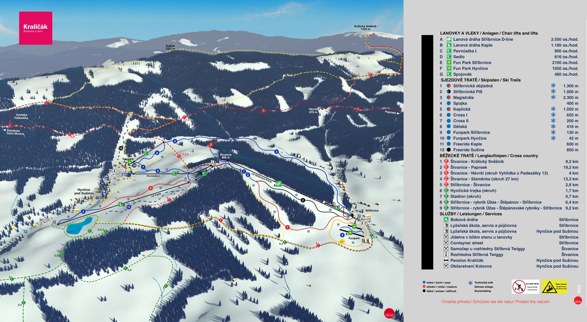 Poznejte skiareál Kraličák - Hynčice - podívejte se, jak vypadá mapa střediska Kraličák - Hynčice, naplánujte si lyžování na další den nebo si znovu připomeňte tratě, které jste už na lyžích projeli. Kliknutím na mapu níže se obrázek zobrazí v nejvyšší kvalitě.