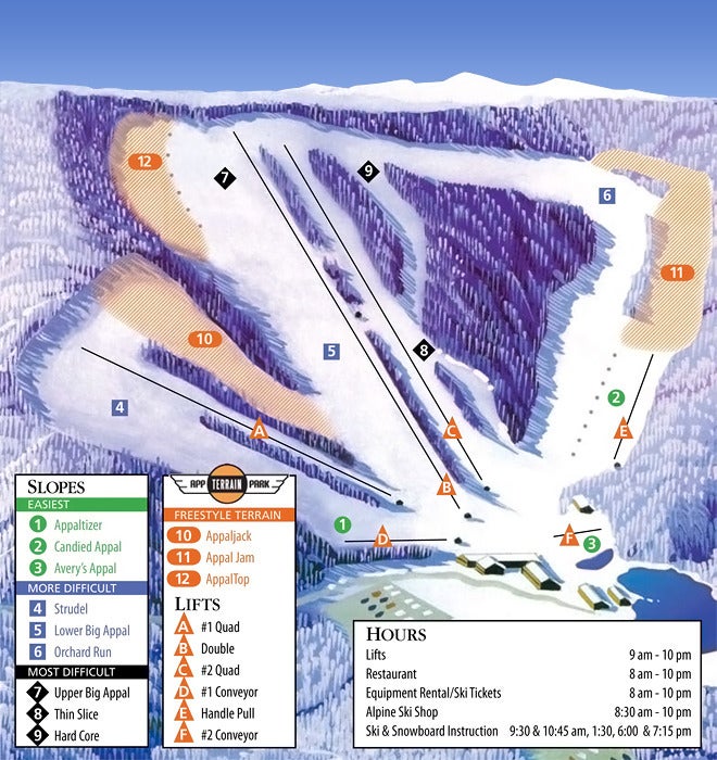 Poznejte skiareál Appalachian Ski Mountain - podívejte se, jak vypadá mapa střediska Appalachian Ski Mountain, naplánujte si lyžování na další den nebo si znovu připomeňte tratě, které jste už na lyžích projeli. Kliknutím na mapu níže se obrázek zobrazí v nejvyšší kvalitě.