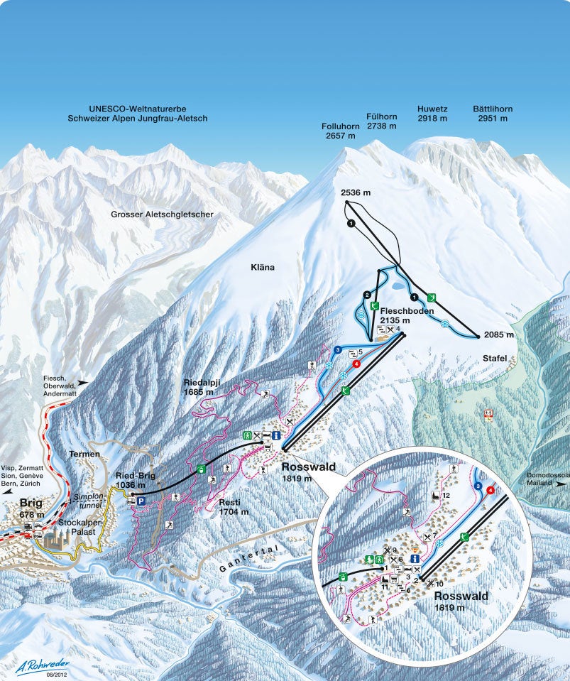 Poznejte skiareál Rosswald - Brig - podívejte se, jak vypadá mapa střediska Rosswald - Brig, naplánujte si lyžování na další den nebo si znovu připomeňte tratě, které jste už na lyžích projeli. Kliknutím na mapu níže se obrázek zobrazí v nejvyšší kvalitě.